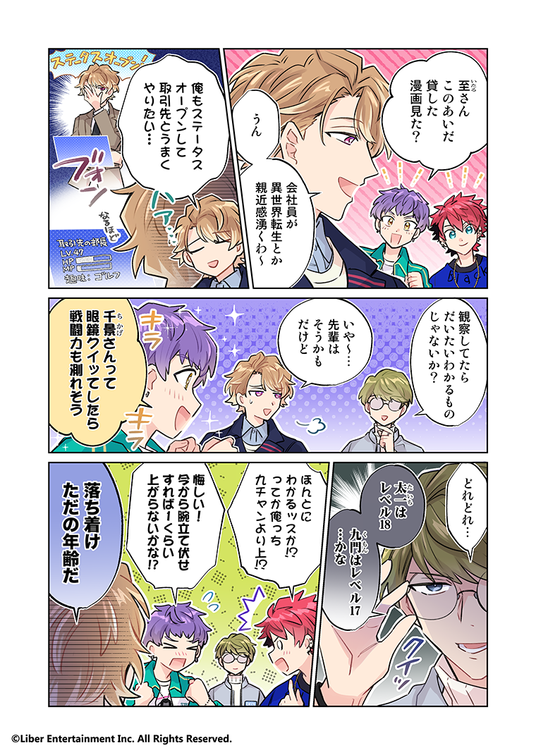 CLOSE 2025.10.22 第425話『チートステータス!?』 でも実際、千景さんの眼鏡って何か特殊な装置だったとしても違和感ないですよね。相手のレベルや戦闘力がわかるとか、どんな言語でも翻訳できるとか……いや千景さんなら眼鏡なしでもシレッとやってのけそうな気もしますが……(By.MANKAI桜子) ❀❀❀ 今週はMANKAIカンパニー日常編をお届けしました! 次回更新は【10月22日】予定!お楽しみに♪ 関連キャラクター 茅ヶ崎 至卯木 千景兵頭 九門七尾 太一 CLOSE