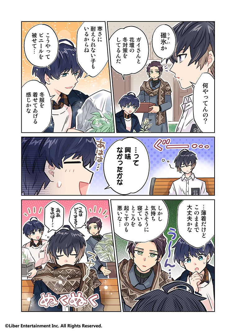 CLOSE 2025.11.26 第430話『みんなの冬支度』 今年の夏も本当~~に長かったですが、涼しくなってからはなんだかあっという間でしたよね。紬さんとガイさんにマフラーや上着を貸してもらった密くん、その優しさのぬくもりでもっと気持ちよく寝られそう♪(By.MANKAI桜子) ❀❀❀ 今週はMANKAIカンパニー日常編をお届けしました! 次回更新は【12月3日】予定!お楽しみに♪ 関連キャラクター 碓氷 真澄月岡 紬ガイ CLOSE