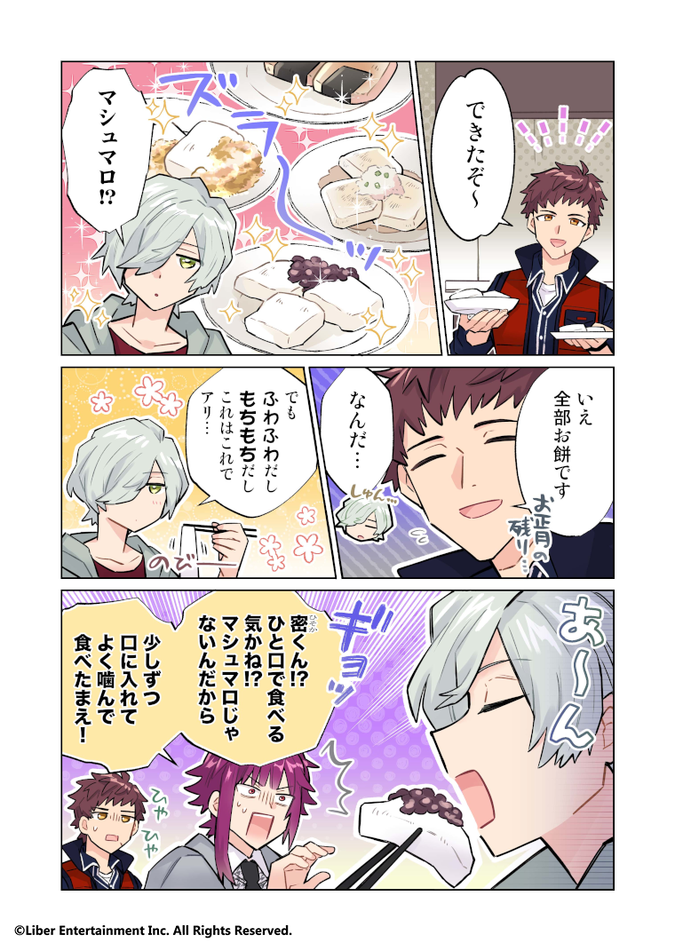 CLOSE 2026.01.14 第437話『和風マシュマロ?』 お正月といえば、ある意味1年で一番お餅を食べる時期。最近ではSNSなどでもいろいろな食べ方が紹介されているので、試してみた方も多いのではないでしょうか。ただめちゃくちゃお腹に溜まるので、一度にいっぱい食べられないのが悔しいんですよね……。(By.MANKAI桜子) 関連キャラクター 伏見 臣御影 密有栖川 誉 CLOSE