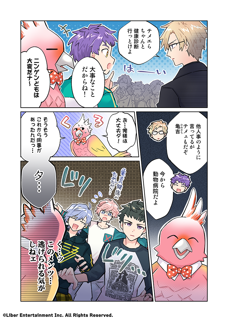 CLOSE 2026.02.11 第441話『健康は予防から』 そうです。亀吉はペットというより大事な家族の一員ですし、みんなの健康が大切ですよね! それにしても、なぜ健康診断ってあんなに緊張するのでしょうか?健康診断に行ったら、イケメン役者のトレカがもらえるとかがあれば何回でも(?)行くのに……!(By.MANKAI桜子) 関連キャラクター 向坂 椋斑鳩 三角兵頭 九門古市 左京高遠 丞亀吉 CLOSE