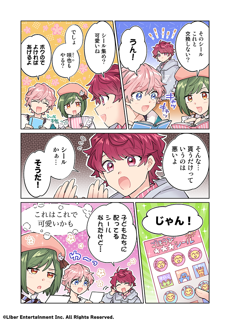 CLOSE 2026.02.25 第443話『かわいいの交換』 流行ってますね、シール交換……! もはや社会現象にまでなっているようですが、皆さんもシール交換は好きですか?幸くんと椋くんのシール帳はよりすぐりのかわいいシールでいっぱいになっていそうですが、咲也くんの笑顔つきの素朴なシールも素敵ですよね。欲しい!(By.MANKAI桜子) 関連キャラクター 佐久間 咲也瑠璃川 幸向坂 椋 CLOSE