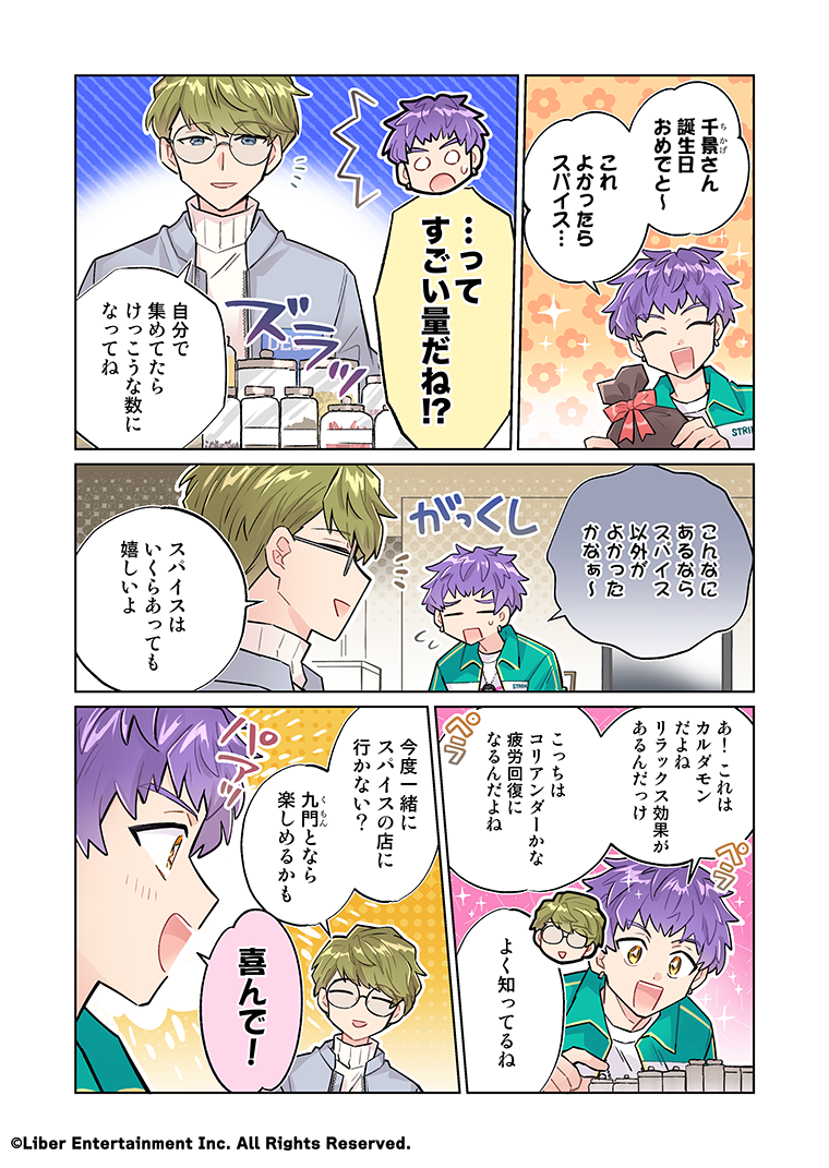 千景さんも驚く九門くんのスパイス知識がすごい! 珍しいスパイスはネットにもたくさんありそうですが、やっぱりお店に行って選ぶのがいいですよね。どの料理にどう使うかを考えたりするのも楽しそう!ぜひ2人で一緒に使うところも見せてほしいところです(By.MANKAI桜子)